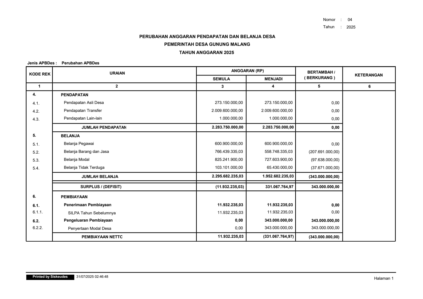 Dalam Rangka Penyelenggaraan Anggaran Pendapatan dan Belanja Desa Tahun 2025 telah dilakukan Perubahan Anggaran Pendapatan dan Belanja Desa Gunung Malang tahun Anggaran 2025.